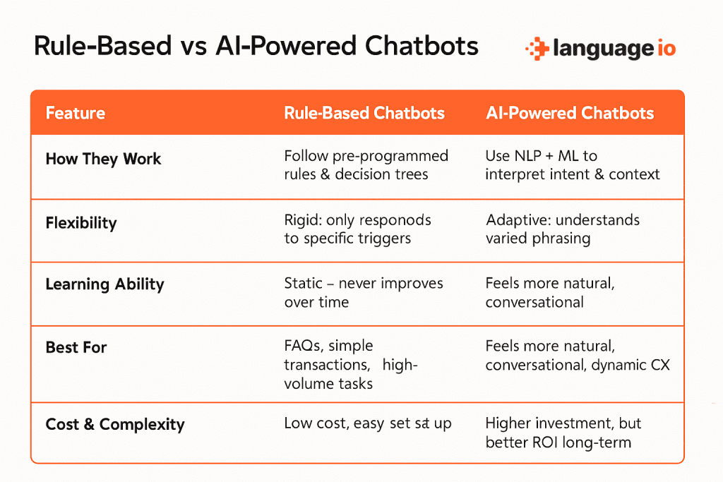 For CX leaders, rule-based chatbots are attractive because they’re cheap, easy to deploy, and great at deflecting common queries. But they also come with a ceiling: the moment customer phrasing strays outside the rules, or outside the default language, the experience collapses.