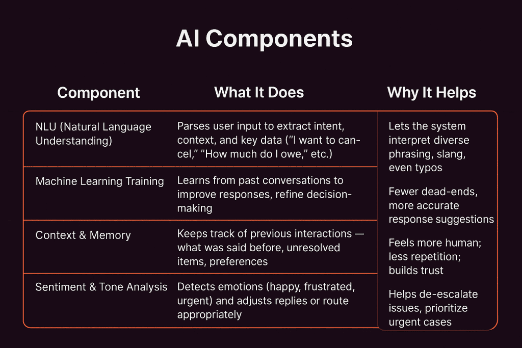 At its core, conversational AI works because all of its moving parts come together in ways that mimic human understanding. NLU lets it catch intent even when phrasing is messy — like interpreting “My Wi-Fi’s acting up again” as a service outage issue. Machine learning improves accuracy over time, so after thousands of “Where’s my order?” queries, it knows that “my shoes never showed up” means the same thing. Context and memory mean you don’t have to repeat yourself; if you told the bot yesterday you ordered a laptop, it won’t ask again today. Sentiment analysis can tell when a customer’s tone is turning angry and escalates to a live agent before things boil over. And with system integrations, conversational AI can actually resolve issues, not just respond, like pulling your account info to confirm a refund or updating an airline reservation on the spot.
