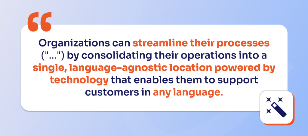 Organizations can streamline their processes, increase occupancy rates, reduce overhead costs and simplify training and recruitment efforts by consolidating their customer support operations into a single, language-agnostic location powered by technology that enables them to support customers in any language. Moreover, by leveraging cutting-edge language technology, centralized teams can empower their agents to communicate fluently, employing proper tone, formality and company terminology with customers in up to 155 languages, ensuring that every interaction is smooth, efficient, and satisfying.