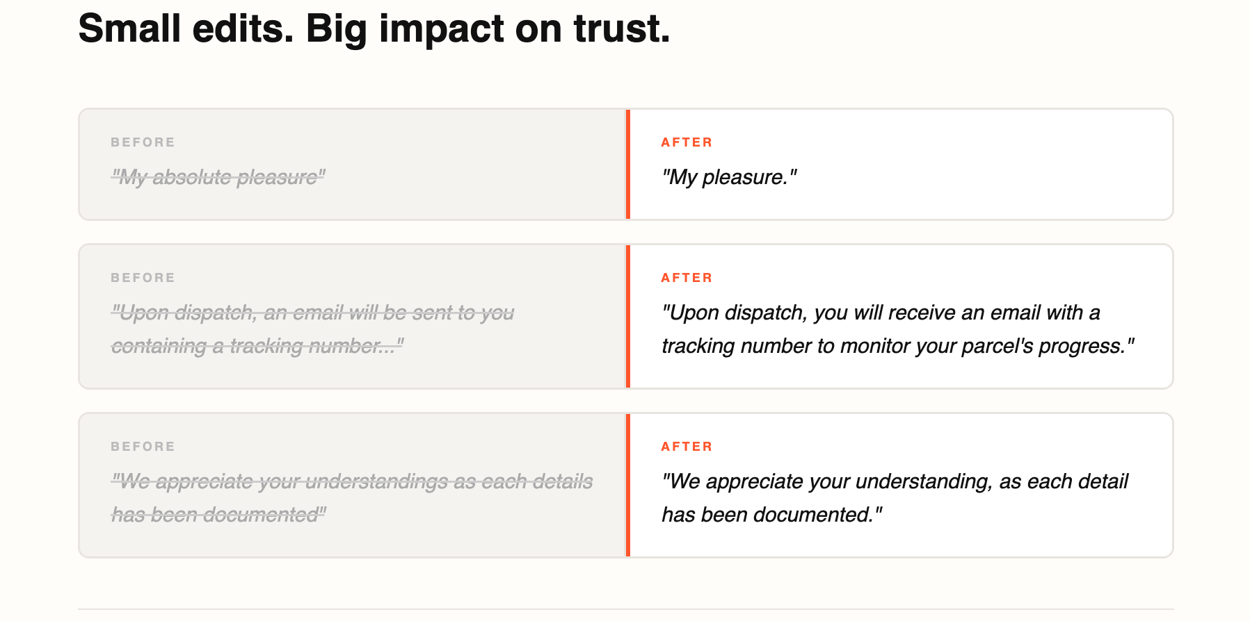 The improvements weren’t about rewriting the brand voice from scratch. They were about systematically removing friction by tightening sentences, aligning tone, clarifying structure, activating verbs. Each edit on its own is small. In aggregate, they change how the company sounds at scale.