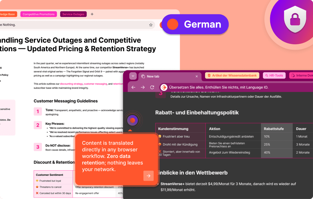 Your teams can translate browser-based content — from internal wikis to HR tools to customer portals — without ever leaving their secure environment. Keeping them informed in any language without exposing sensitive information.