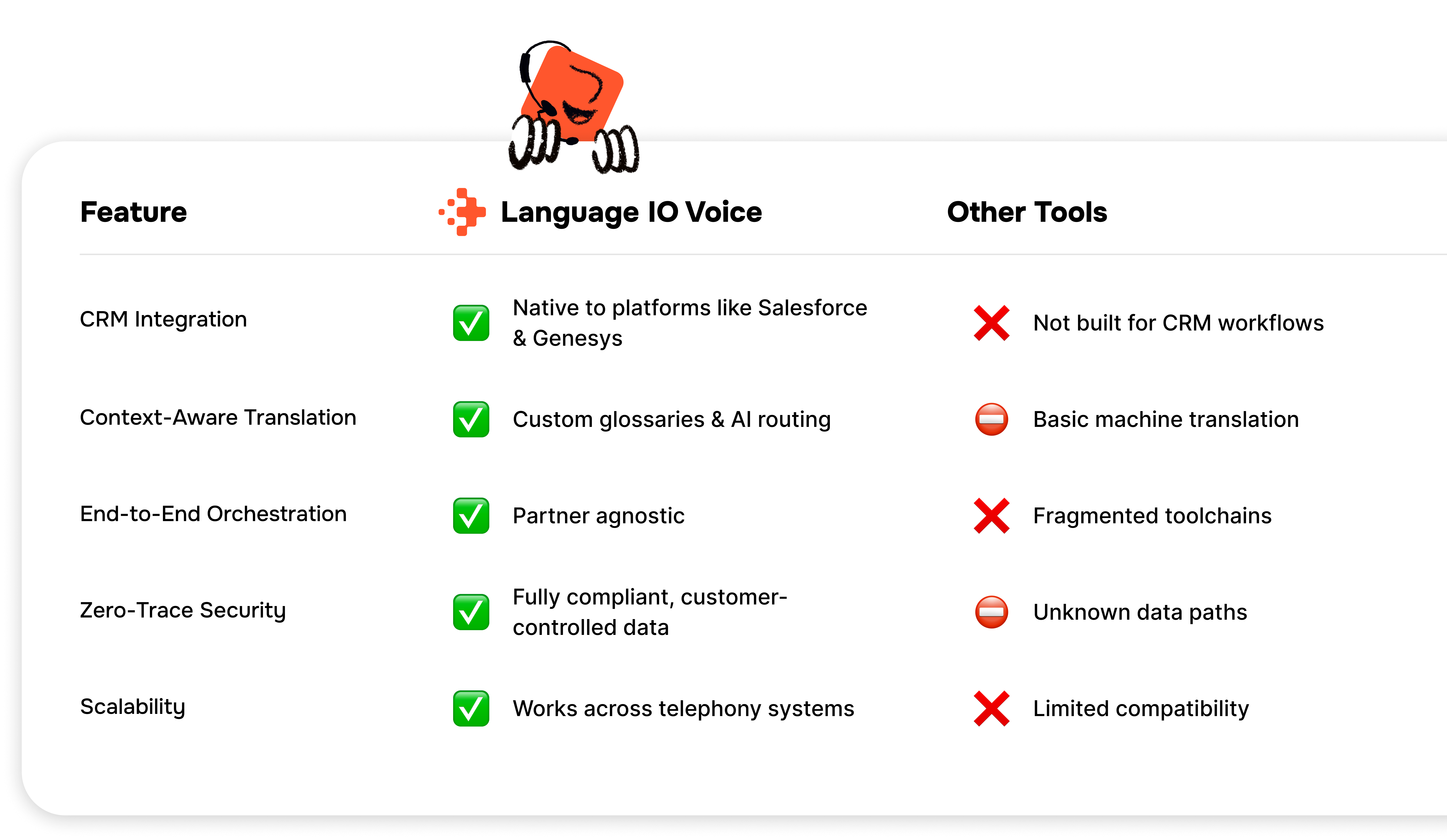 Language IO Voice brings enterprise-grade translation to the one channel global companies have struggled to scale: voice. By combining real-time AI, glossary-powered accuracy, and secure telephony integration, we enable your agents to deliver native-quality conversations no matter the language, location, or volume.